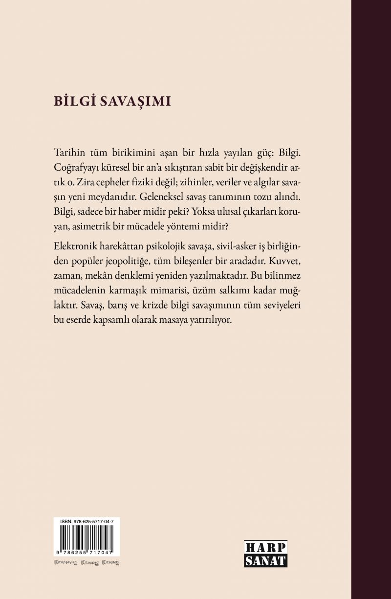 Elektronik harekâttan psikolojik savaşa, sivil-askerî iş birliğinden popüler jeopolitiğe, tüm bileşenler bir aradadır. Kuvvet, zaman, mekân denklemi yeniden yazılmaktadır. Bu bilinmez mücadelenin karmaşık mimarisi, üzüm salkımı kadar muğlaktır. Savaş, barış ve krizde bilgi savaşımının tüm seviyeleri bu eserde kapsamlı olarak masaya yatırılıyor.