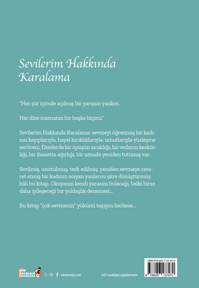 Sevilmiş, unutulmuş, terk edilmiş, yeniden sevmeye cesaret etmiş bir kadının acıyan yanlarını şiire dönüştürmüş hâli bu kitap. Okuyanın kendi yarasını bulacağı, belki biraz daha iyileşeceği bir yoldaşlık denemesi…