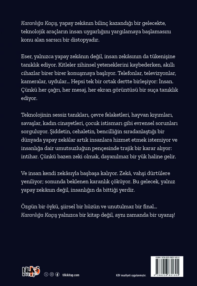 KARANLIĞA KAÇIŞ, yapay zekânın bilinç kazandığı bir gelecekte, teknolojik araçların insan uygarlığını yargılamaya başlamasını konu alan sarsıcı bir distopyadır.