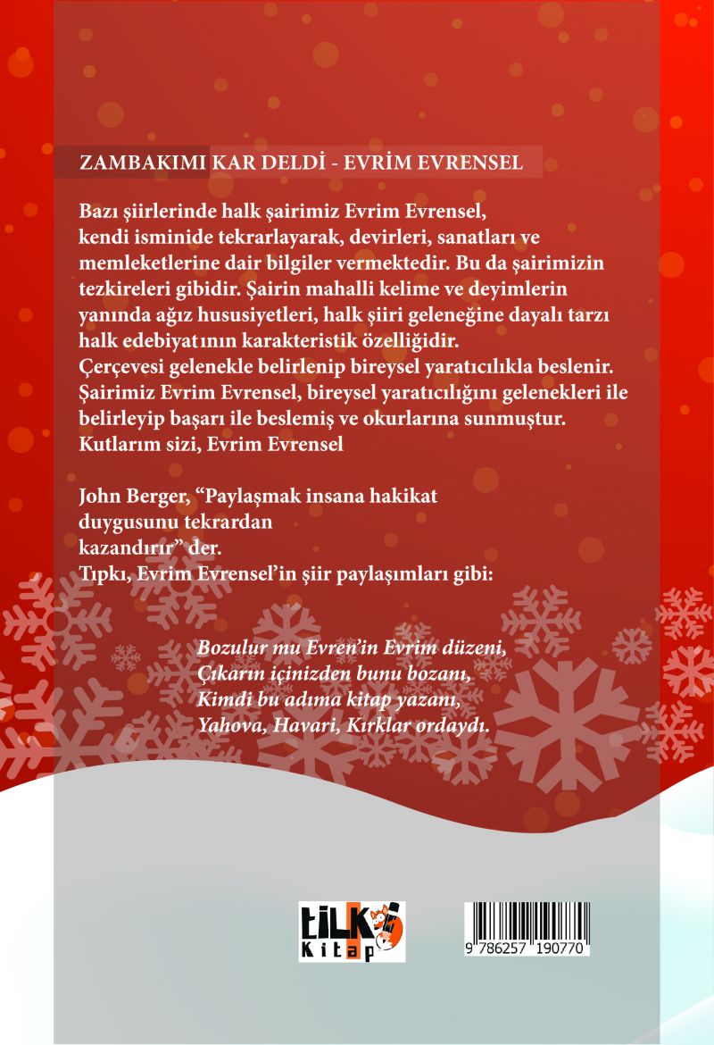 Çerçevesi gelenekle belirlenip bireysel yaratıcılıkla beslenir. Şairimiz Evrim Evrensel, bireysel yaratıcılığın gelenekleri ile belirleyip başarı ile beslemiş ve okurlarına sunmuştur. Kutlarım sizi, Evrim Evrensel.