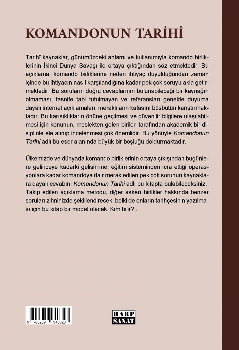 Tarihî kaynaklar, günümüzdeki anlamı ve kullanımıyla komando birliklerinin İkinci Dünya Savaşı ile ortaya çıktığından söz etmektedir. Bu açıklama, komando birliklerine neden ihtiyaç duyulduğundan zaman içinde bu ihtiyacın nasıl karşılandığına kadar pek çok soruyu akla getirmektedir. Bu soruların doğru cevaplarının bulunabileceği bir kaynak olmadığı gibi tasnife tabi tutulmayan ve referansları genelde duyuma dayanan internet kaynaklı bilgiler de meraklıların kafasını büsbütün karıştırmaktadır Bu karışıklıkların önüne geçilmesi ve güvenilir bilgilere ulaşılabilmesi için konunun, meslekten gelen birileri tarafından akademik bir disiplinle ele alınıp incelenmesi çok önemlidir. Bu yönüyle Komandonun Tarihi, alanındaki boşluğu doldurmaya aday bir eserdir. Ülkemizde ve Dünyada komando birliklerinin ortaya çıkışından bugünlere gelinceye kadarki gelişimine, eğitim sisteminden icra ettiği operasyonlara kadar komandoya dair merak edilen pek çok sorunun kaynaklara dayalı cevabını Komandonun Tarihi'nde bulabileceksiniz. Takip edilen açıklama metodu, diğer askerî birlikler hakkında benzer soruları zihninizde şekillendirecek, belki de onların tarihçesinin yazılması için bu kitap bir model olacaktır. Kim bilir?